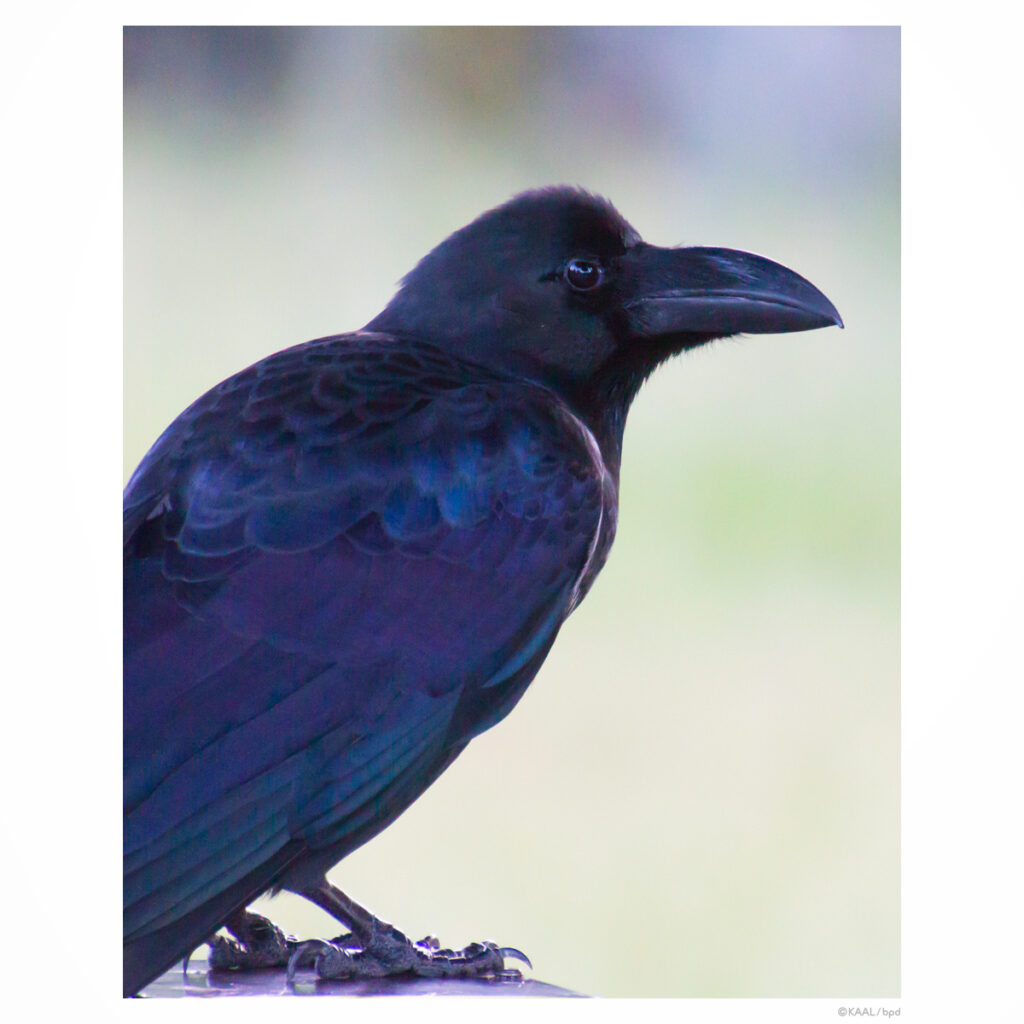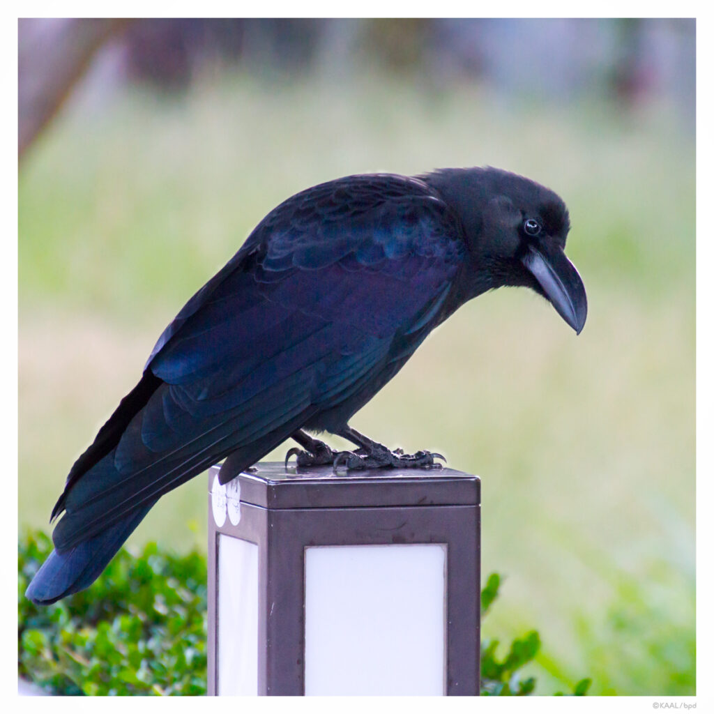 写真は「ハシブトガラス」。羽根が瑠璃色(深い青紫色)。内側の羽毛も同じく瑠璃色で深みがある。一方「ハシボソガラス」の場合、羽根はより黒色で、内側の羽毛は白色だ。