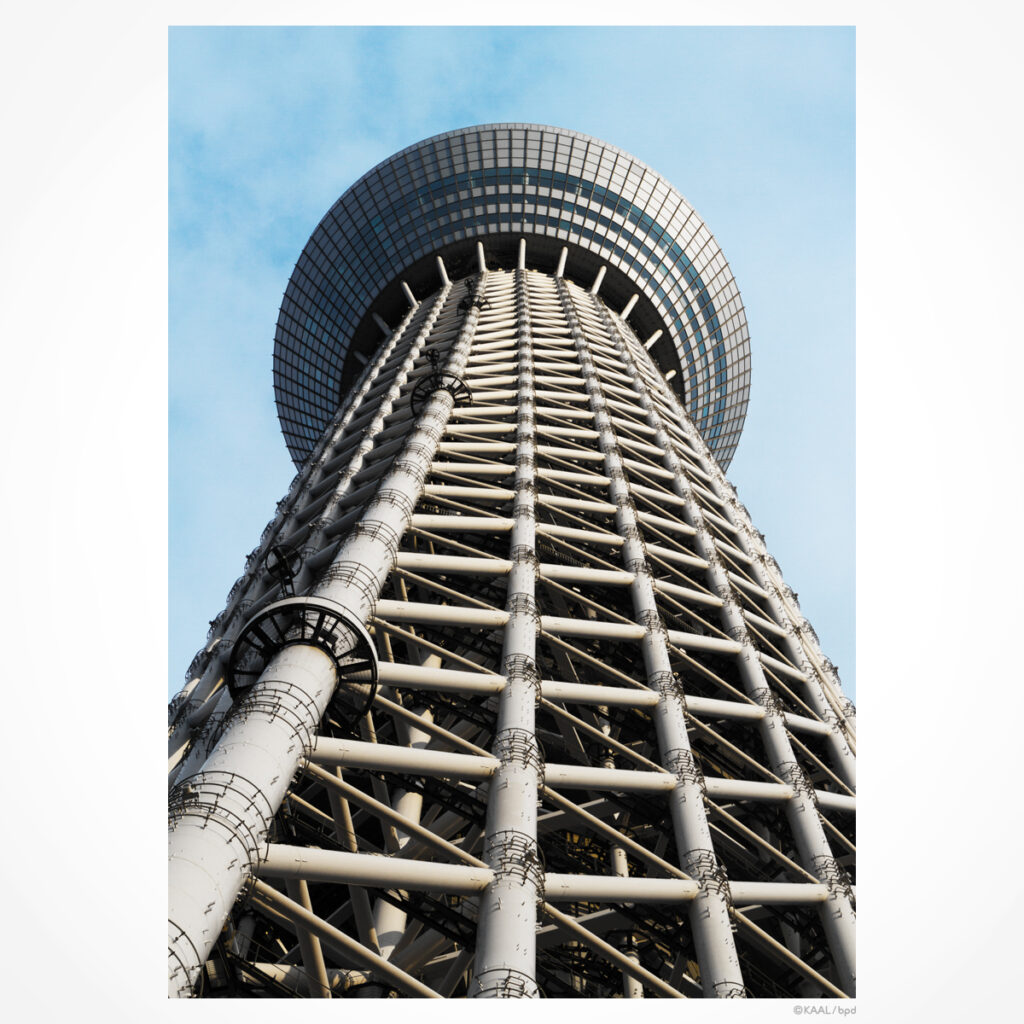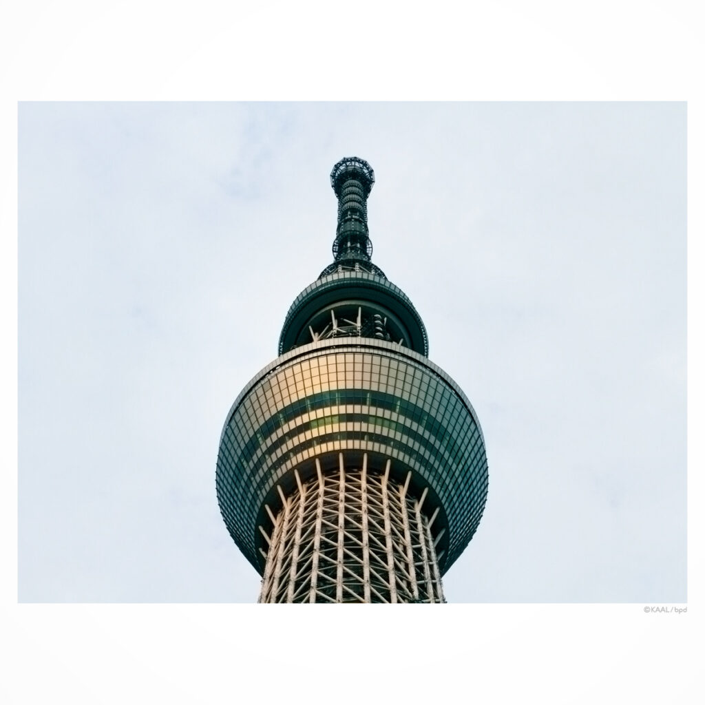 スカイツリーは柱が3本脚の設計※なので、遠くから見るときれいなシンメトリー(左右対称)にならず傾いているように見える。